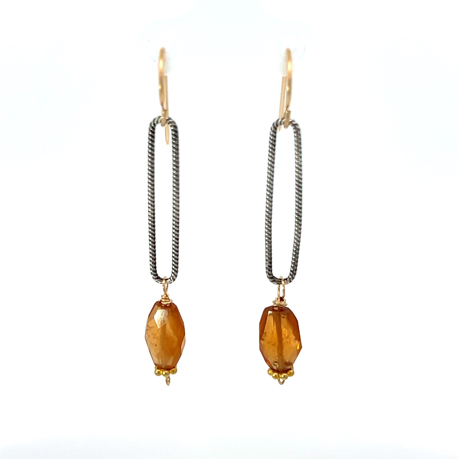 Glistening hessonite garnet find their home swinging from these fine elongated twist hoop earrings. The faceted columns of hessonite garnet are delicately wire wrapped in 14kt gold fill metal with matching ear wire of the same metal.