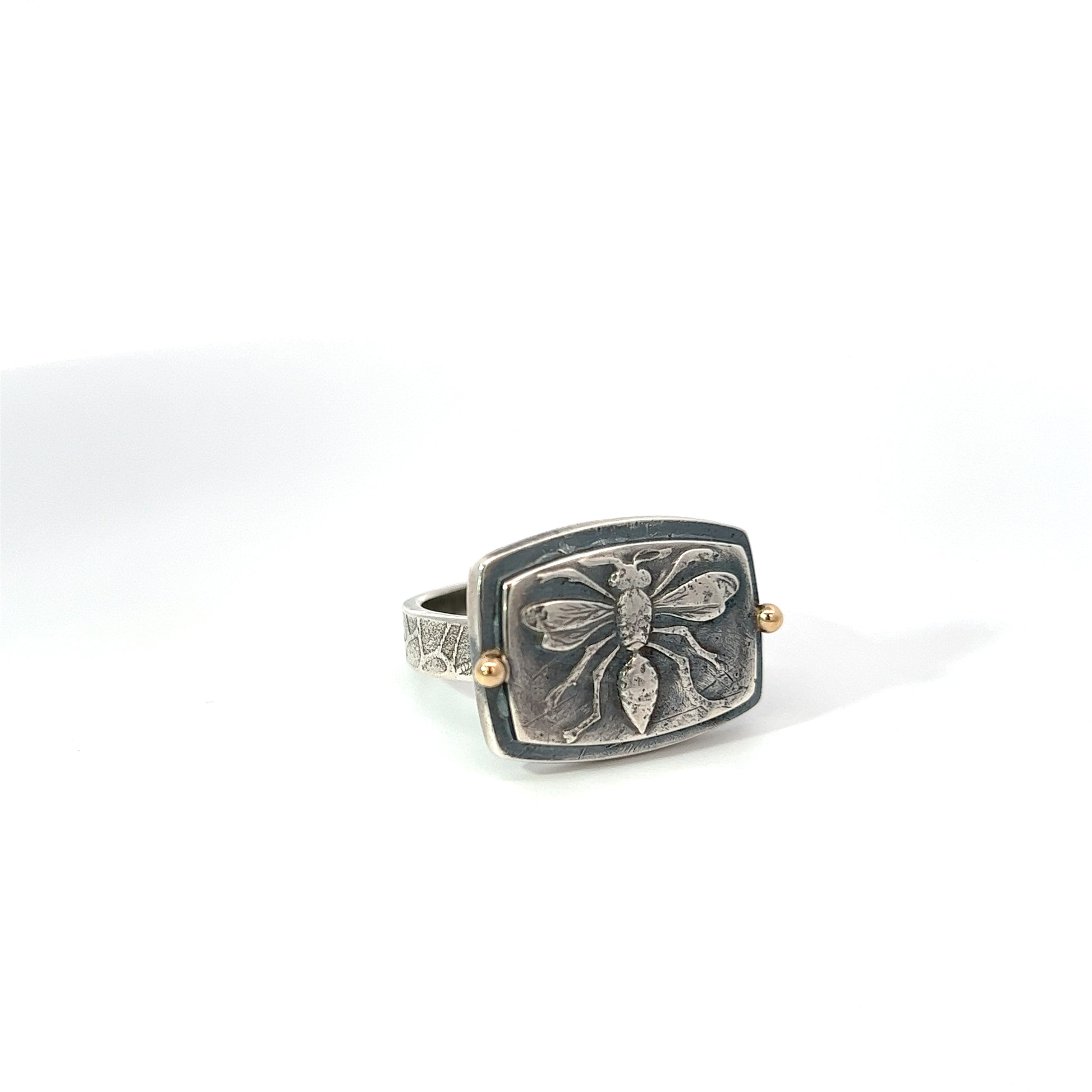 This new mixed metal ring is sure to attract all the buzz. Using recycled sterling this gorgeous pollinator ring is solid and invokes a vintage feel. Two beads of 14kt gold elevate the oxidized , hand rubbed finish. Ring band is hand textured and approx 4mm wide. This ring is a size 8 and be made slightly larger.