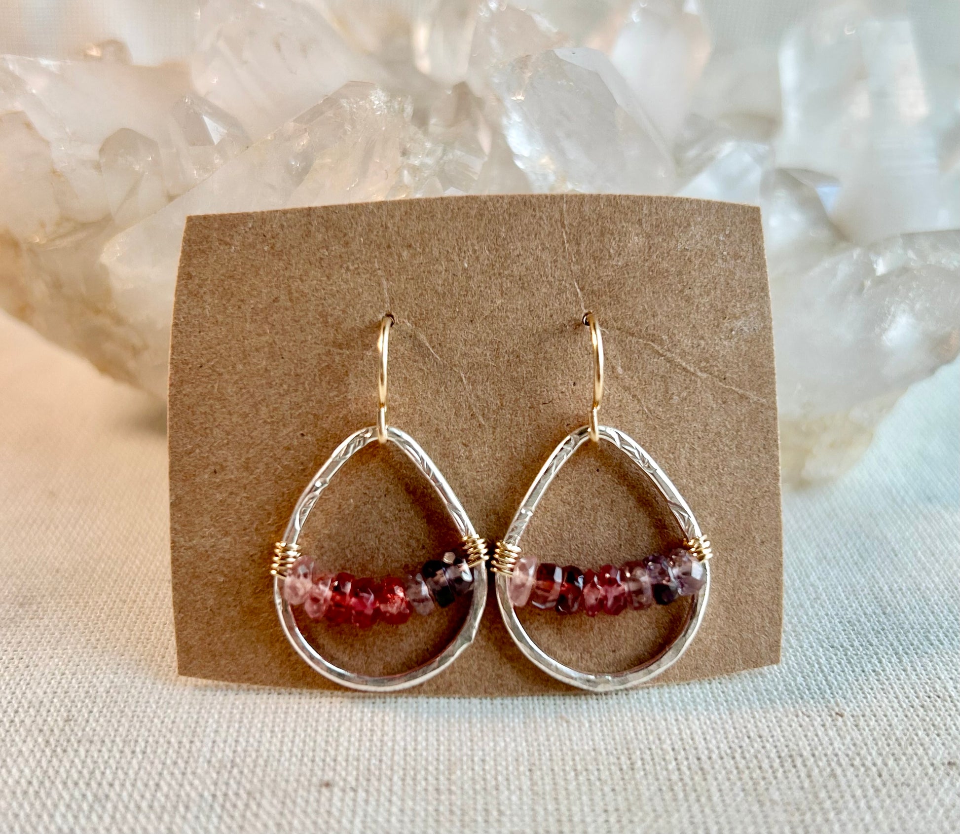 Made from sterling silver and hints of 14 kt gold fill wire. These new hoops are sure to brighten up your look. Spinel has become a favorite gemstone of mine due to its vast color range and subtle tones. These hoops are finished with 14kt gold fill ear wires and measure just about 1" in length and diameter. Lightweight and modern.