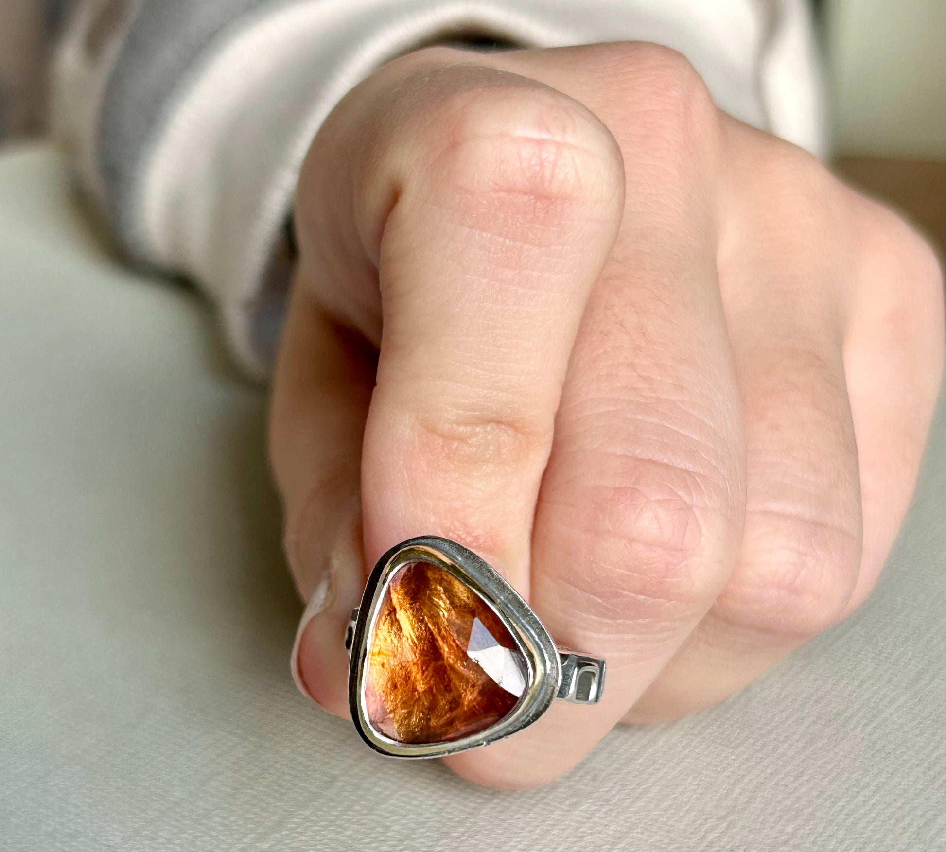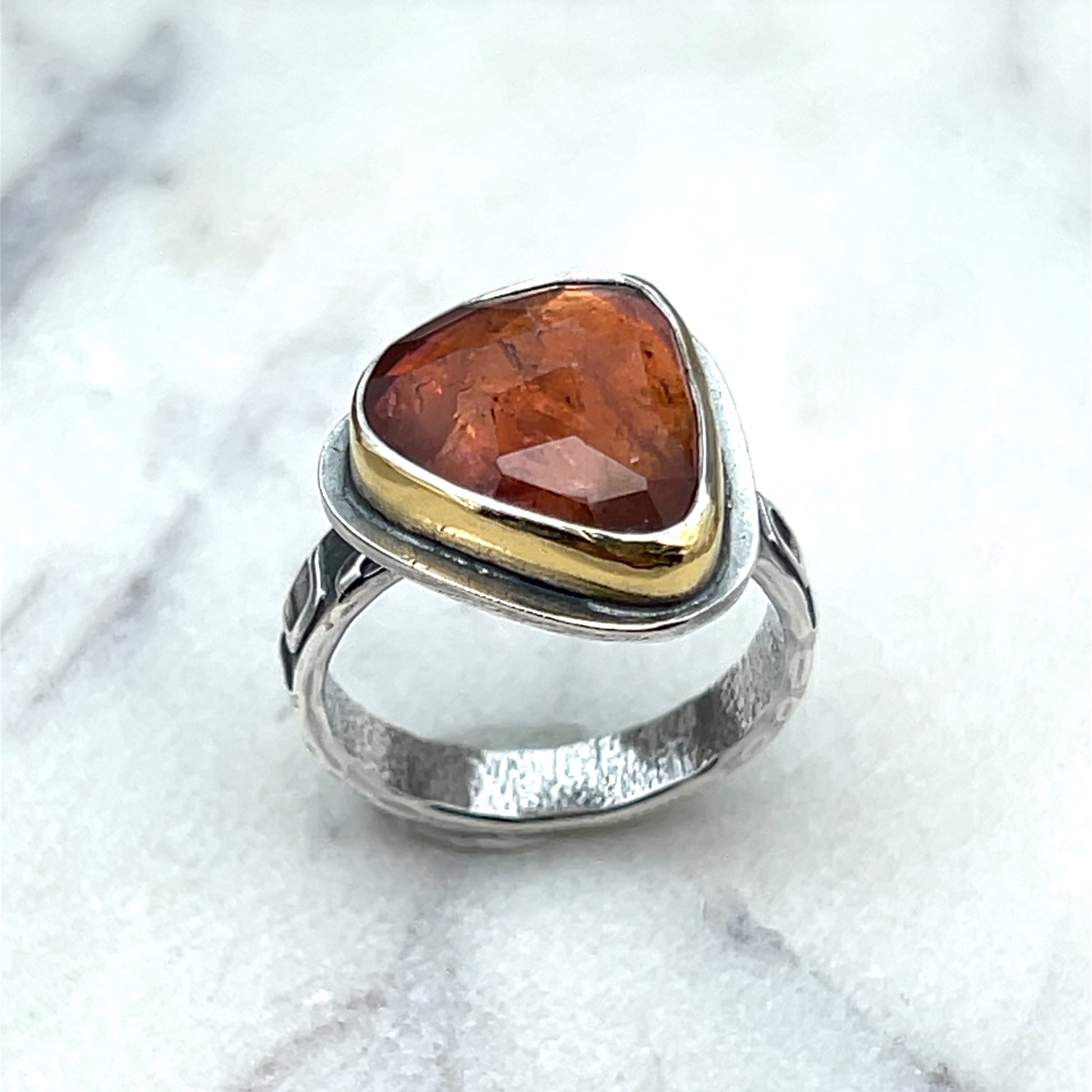 This one of a kind beauty has a 24kt keum boo smooth bezel setting. Keum is 24kt gold foil that has been fused to fine silver. This durable combination of gold and oxidized sterling is classic, yet modern. The triangular shape stone has a rose cut surface, with shades of pink to peach in color.