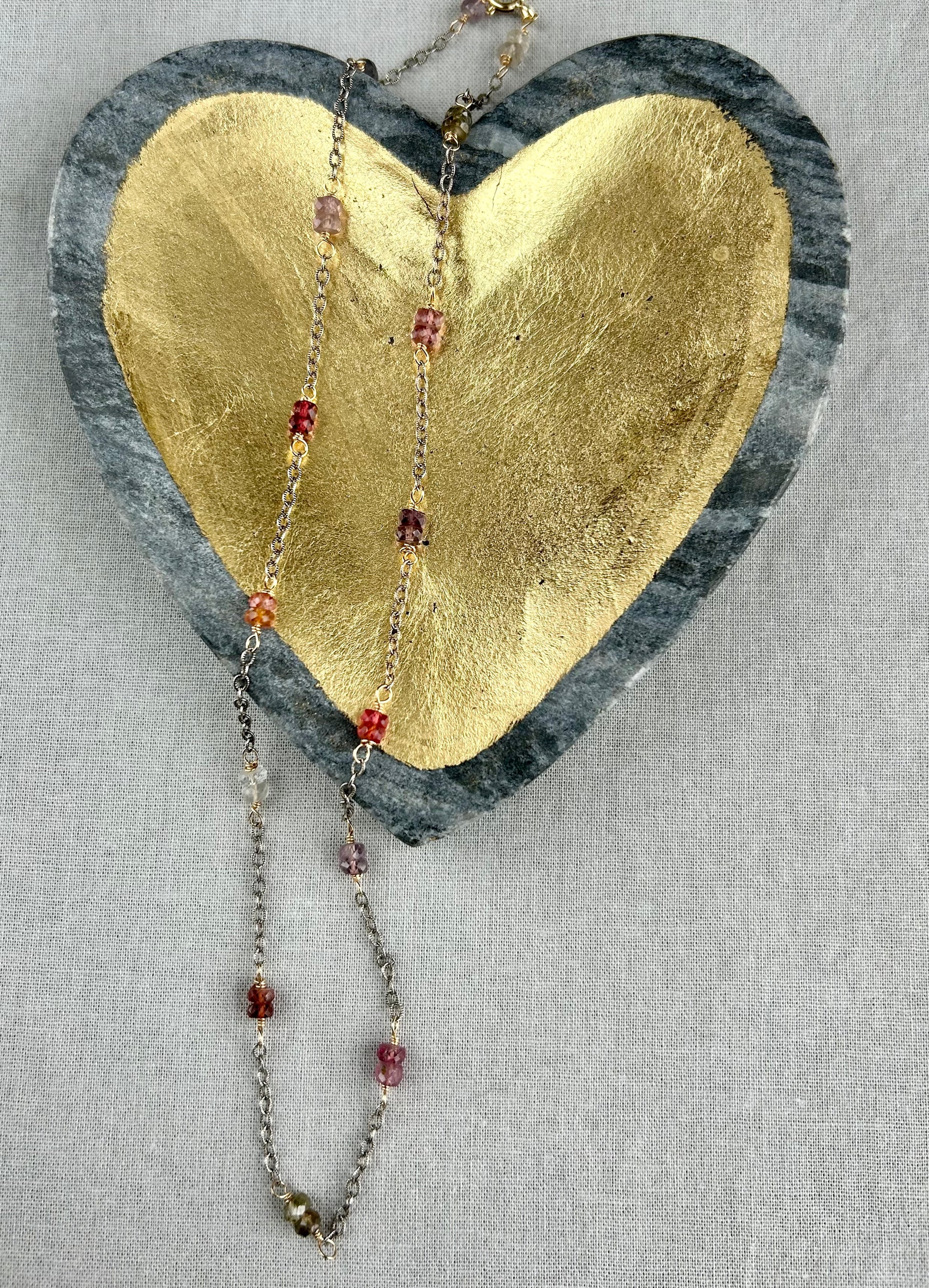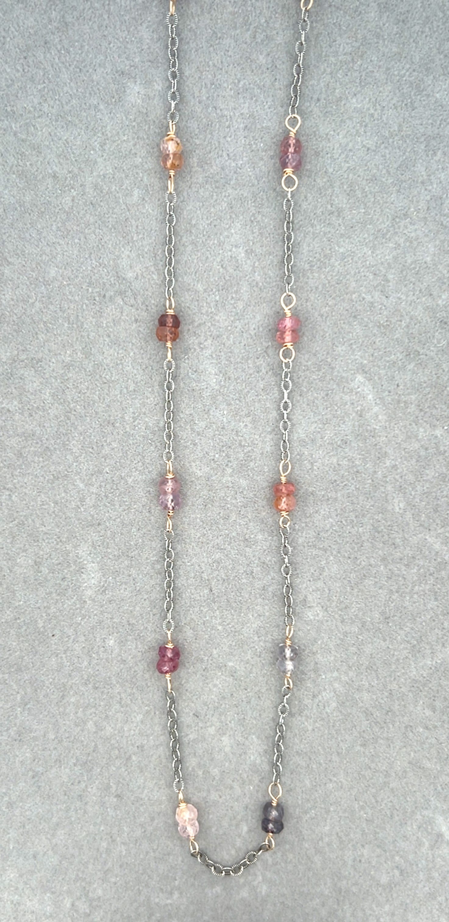 Groupings of brilliant spinel are hand wrapped in 14kt gold fill against this oxidized sterling chain. Displaying all the color range of this gorgeous gemstone. The stones are approximately 4mm rondelles and are wrapped in pairs throughout the necklace. This piece measures 16 " length with a 2" extender. This is a great layering piece to wear with a longer gold or silver necklace.