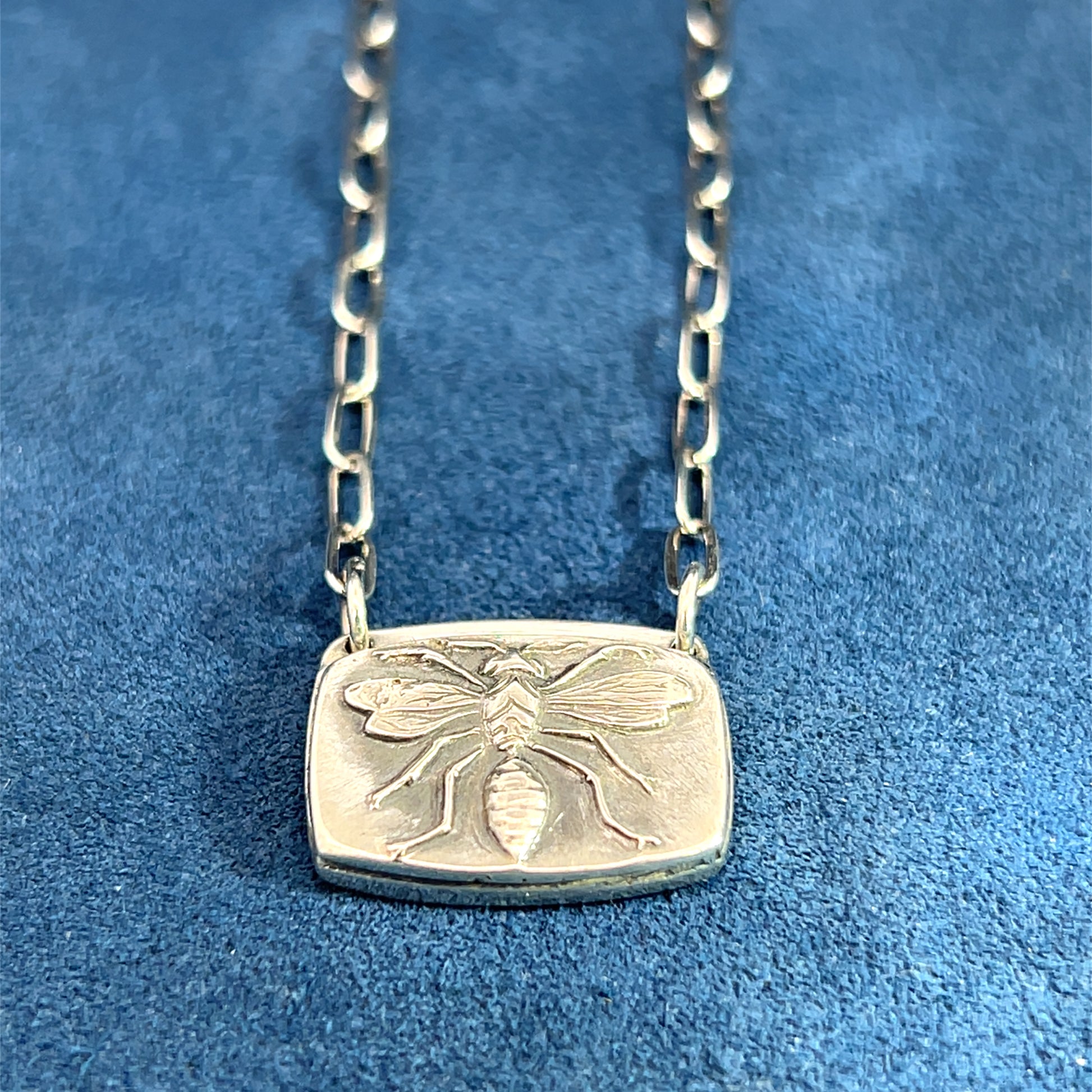 Hanging from a sturdy paperclip chain in sterling. I've oxidized the whole piece to highlight the subtle details of the bee, hand polished to finish. This piece measures 17" in length with a 1" extender.