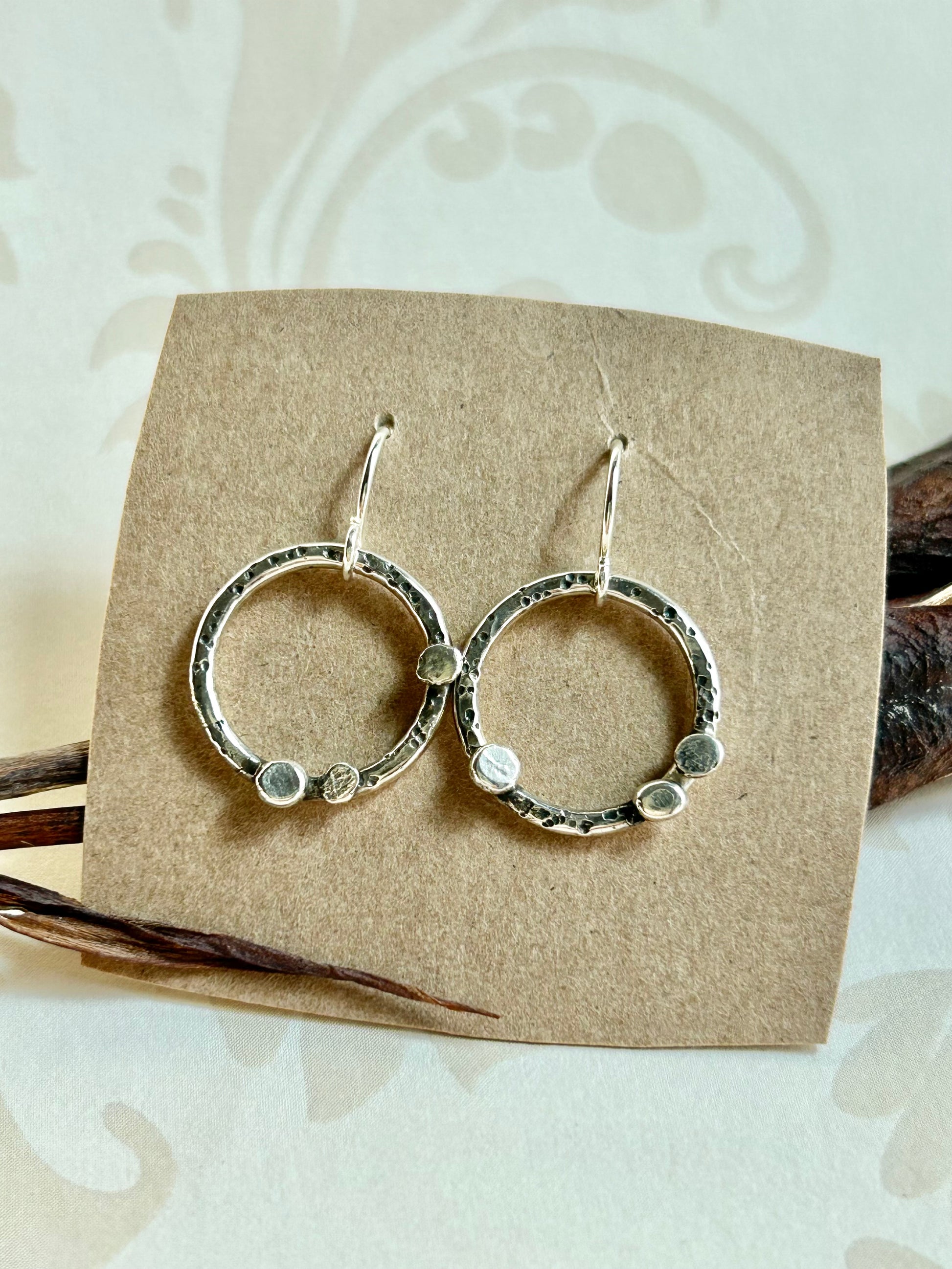 These new sterling silver hoops are hammer textured and adorned with flat dots of sterling. Completely hand forged and measuring just over 1/2" in diameter. Perfect and simple enough for everyday wear but with an artisan flare. Oxidized and hand polished, sterling french ear wires with acrylic backs.