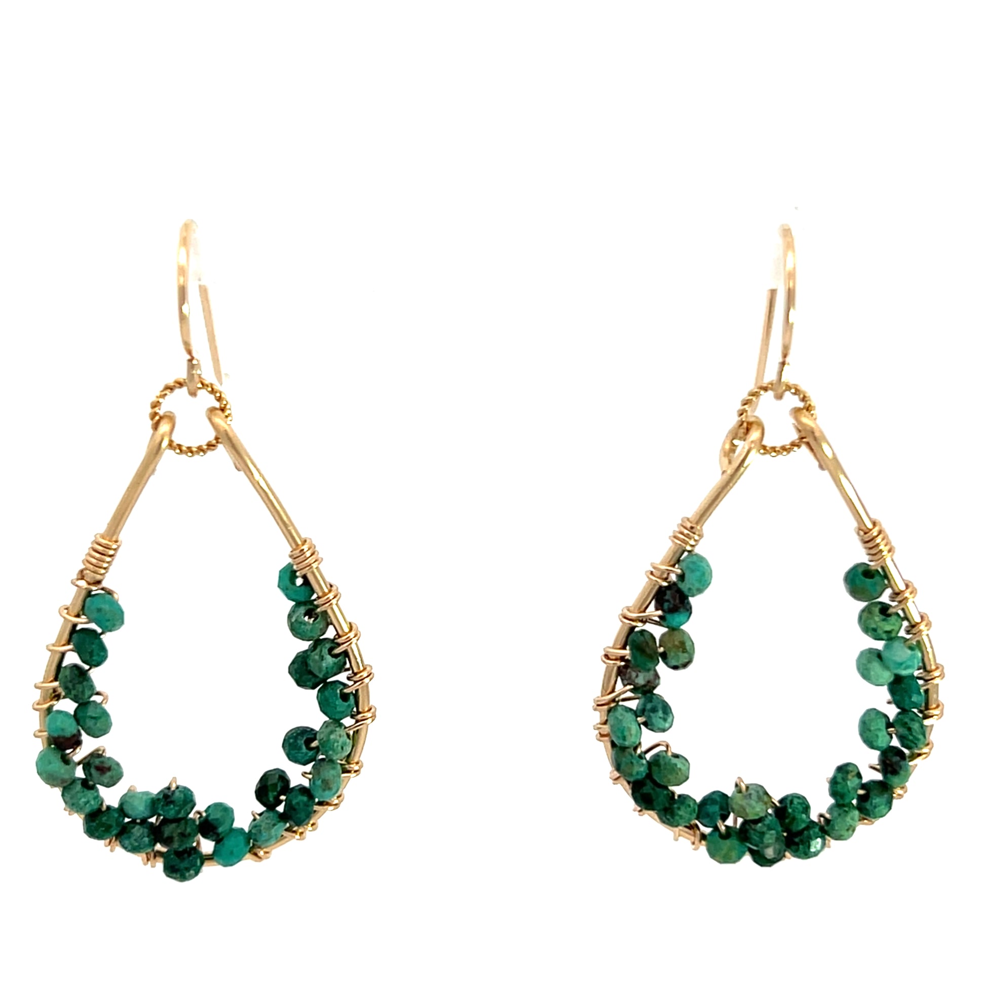 Faceted turquoise beads in a softer tone for Fall. These new oblong shaped gold fill hoops measure 1 and a quarter inches in length by about an inch in width. Surprisingly lightweight,