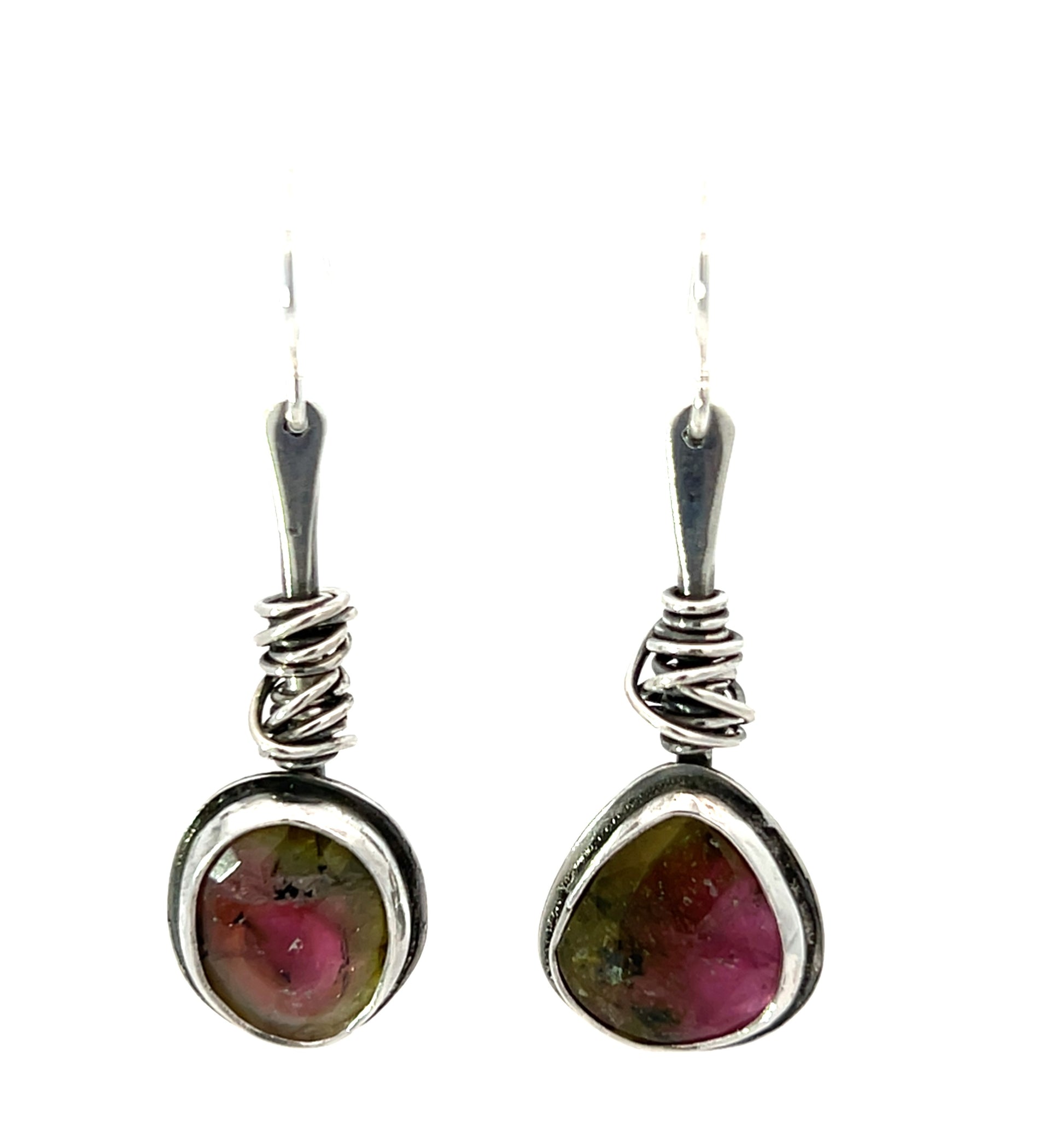 These new wire wrapped drop earrings showcase a pair of gemmy rose cut watermelon tourmalines. They are a one of a kind design.